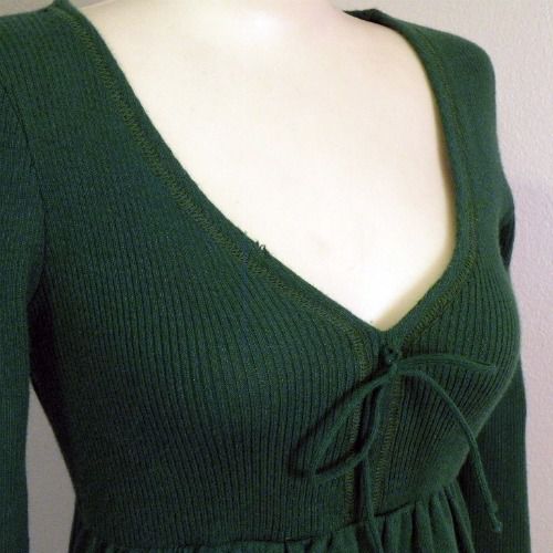 This is a cotton knit, perhaps a blend. Deep forest green in color. The bodice is ribbed, with a deeply dipped front neckline, which is embellished with a bow at the decollete. The bodice has lots of stretch, so there's room for an array of bust sizes.