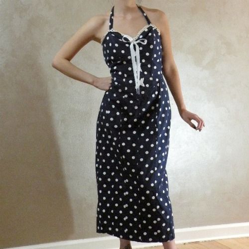 Buttons at the top make this dress convertible to either halter or shoulder straps. The dress is 100% cotton and is dark navy blue with big white polka dots. Closes at the back with a long nylon zipper.