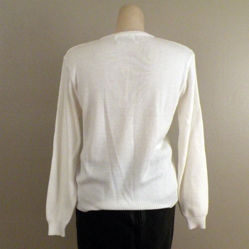 The acrylic knit is winter white in color; the koalas are embroidered in varying fall tones. They look like they're trying to climb to the very top of the eucalyptus tree. Ribbed neckline, wrists and hem. Very soft acrylic, a lovely little sweater.